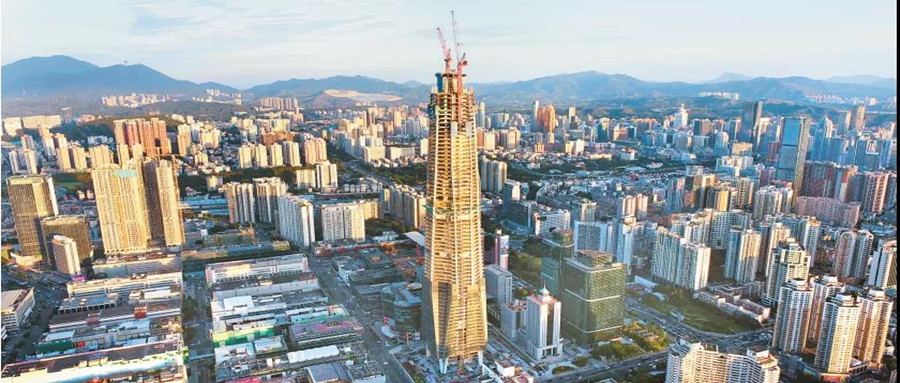 城脈金融中心大廈項目位于深圳市羅湖區紅嶺北路與桃園路交會處,由中建三局承建。項目建筑高度388米,總建筑面積約18萬平方米,是一棟集辦公、會所、公寓于一體的超高層建筑。該項目建筑高度388米,采用我國自主研發的有“空中造樓機”之稱的智能建造新技術,讓建筑施工在高空中如履平地,助力大廈以4天一層的速度快速爬升,較傳統模架工效提高30%。