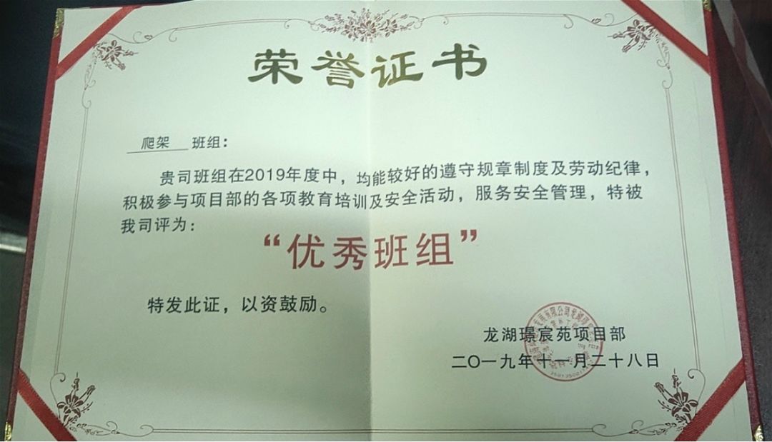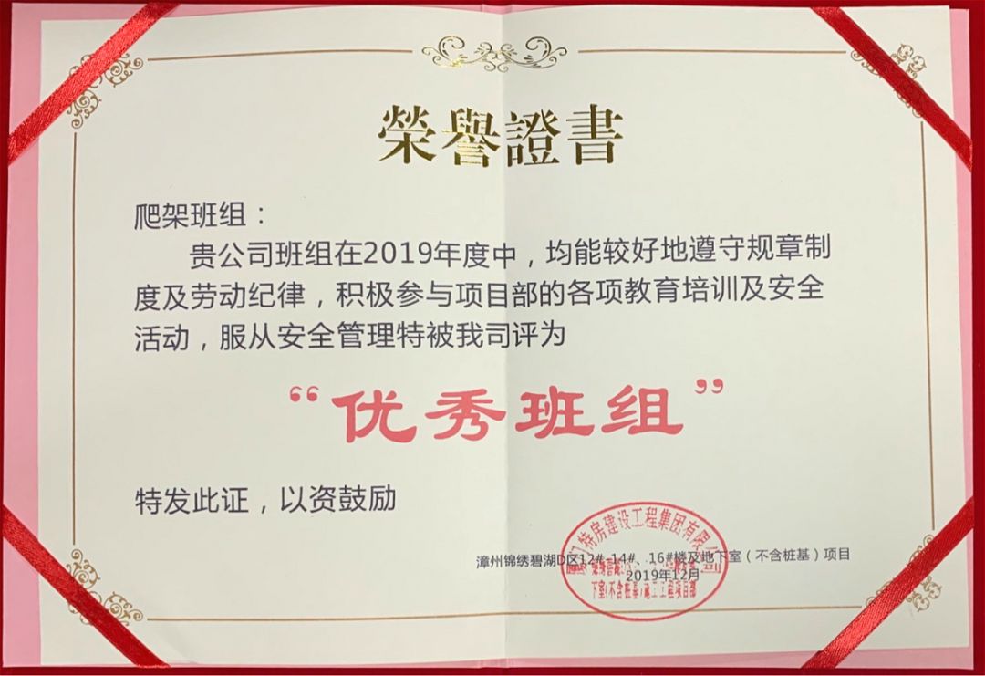 ?廈門安科榮獲安徽三建廈門分公司頒發(fā)的2019年“優(yōu)秀班組”榮譽(yù)證書