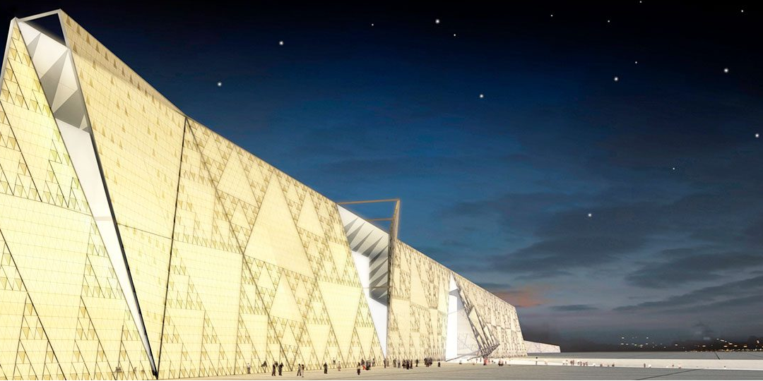 該建筑位于吉薩金字塔附近,是世界上最大的考古博物館,其建造歷時將近二十年(大約與建造吉薩大金字塔的時間相同),花費了近十億美元以保存該國古老遺產。它由Heneghan Peng Architects事務所設計,博物館俯瞰約兩公里外的吉薩金字塔,并利用大量的玻璃將博物館和金字塔拼湊在一起,呈三角形狀。